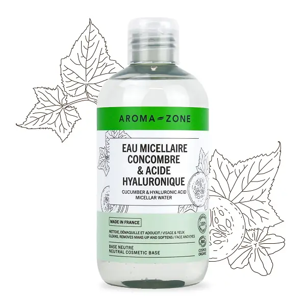 Обогатена с утоляваща жаждата и омекотяваща прясна органична краставица, тази мицеларна вода, формулирана от много меки съставки, извлечени от захар със солюбилизираща сила, ефективно почиства и премахва грима от лицето, очите и устните. Нечистотиите, гримът, себумът, потта и частиците замърсяване ще бъдат перфектно елиминирани с един жест! Обогатен с изпълваща хиалуронова киселина и успокояващо органично алое вера, той осигурява мекота, еластичност и комфорт. Кожата е по-свежа, чиста и по-сияйна. 100% от естествен произход, без парфюм или алкохол и сертифицирана органична, тази мицеларна вода спазва физиологичното pH и е подходяща за всеки тип кожа, дори и за най-деликатната. Може да се използва чист или обогатен с активни съставки, за да се създаде 100% персонализирана мицеларна вода.