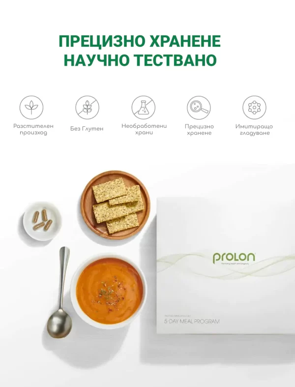 ProLon е само 5-дневна хранителна програма, проектирана и тествана от 14 университета по света, за да ви нахрани с висококачествени храни на растителна основа, като същевременно предизвиква клетъчните и метаболитни ползи от продължителното гладуване. Това е научен пробив, който изисква 2 десетилетия и 34 милиона долара изследвания. и получи над 40 патента —включително единствения патент в историята за хранителна програма за подобряване на дълголетието и продължителността на здравето. Продължителното гладуване (>2-3 дни) има уникални предимства като автофагия или обновяване на клетките, което беше удостоено с Нобелова награда за медицина през 2016 г. Наистина, първите 2-3 дни на гладуване тялото изгаря мазнини, за да компенсира първия етап на калориен дефицит, но впоследствие гладуването се превръща в „положителен стрес“ за всяка клетка в тялото ви, която след това преминава през подмладяване и автофагия, чудо на нашата човешка биология, което е от решаващо значение за здравословното стареене и дълголетие. Днес ние ускоряваме клетъчното обновяване като влизаме в периоди на автофагия, възстановяване и подмладяване. За 5 кратки дни ProLon позволява на тялото ви да премине в тов състояние на подмладяване, като същевременно консумирате всички макро – и микро хранителни вещества, за да поддържате тялото си подхранено. Вие сте здрави (тялото, умът и душата) и също толкова жизнени, колкото клетките ви. Добавете ProLon към ежедневния си начин на живот и обновете клетките си. Всичко необходимо за вашето 5-дневно гладуване с храна. ProLon е проектиран и клинично тестван от 14 глобални университета, за да подхранва тялото ви с висококачествена растителна храна, като същевременно предизвиква клетъчни, метаболитни и емоционални ползи от продължителното гладуване.